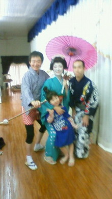 朝10時よりウムアラマ日本人会公演。今日から新メニュー「踊り」始めました。今回、染雀くんが来れなくなったのでムリやわなぁ、と思いながらも一応立ち回り用の傘、刀、着物を持って来たし、せっかく「かっぽれ」吹き込んでもらったし使おか?という事になり、スタッフ兼マジシャンの坂野さんとカメラマン兼笛吹きのチカコさんがけんかかっぽれ、私と鶴笑くんが立ち回りで、最後刀で切り付ける役でなごみまで出す事になり、前日ホテルのプールサイドで猛特訓した。鶴笑くんは2、3回やったらもう覚えたけど問題はけんか組。晩ご飯の後もウチの部屋で何度もやり、当日も会場早入りして合わせた。結果、いくつか手が抜けたり曲に遅れたりはしたが、妙な夫婦喧嘩のようでそれなりに見えていた。明日は総踊りもやるか?