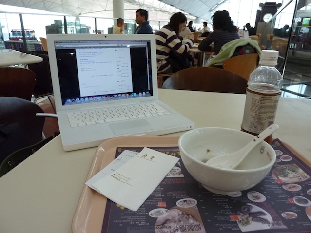 空港で朝ご飯のピータン粥食べながら、日記更新。